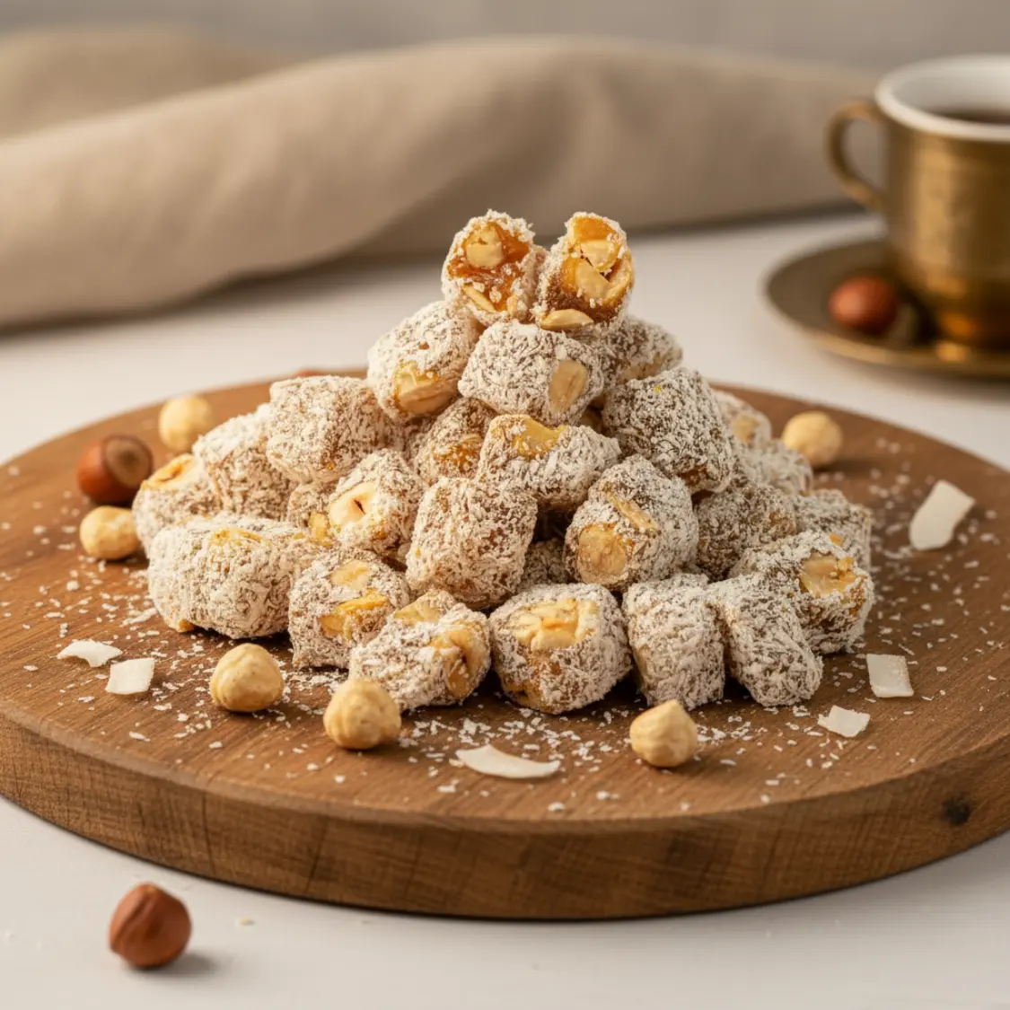 Toptan çifte kavrulmuş fındıklı lokum, özenle seçilmiş kaliteli fındıkların bolca kullanıldığı, geleneksel yöntemlerle iki kez kavrularak hazırlanan enfes bir lezzettir. Hem yoğun fındık aroması hem de yumuşacık lokum dokusu ile damakta uzun süre kalan bir tat sunar. Böylece sizler farklı farklı ürün arayışına girmeden, en özel lokum lezzetini tek bir ürünle bulabilirsiniz.